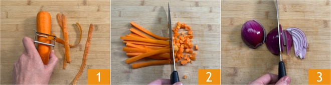 Para preparar as almôndegas vegetarianas, como primeiro passo descasque a cenoura 1, depois corte-a primeiro em tiras e depois em cubos de 5-7 mm 2. Corte as cebolas em fatias finas 3.