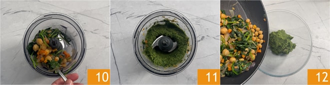 Retire metade dos legumes, transfira para um mixer 10 e triture até obter uma mistura homogênea 11. Depois coloque em uma tigela e adicione o restante dos legumes 12.