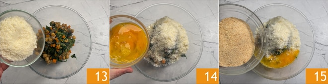 Acrescente o parmesão 13, os ovos 14 e a farinha de rosca 15.