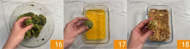 Misture os ingredientes para obter uma massa modelável 16. Forme as almôndegas, com cerca de 35 g cada, e passe primeiro nos ovos 17 e depois na farinha de rosca grossa 18.