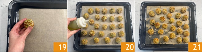 Coloque-as em uma assadeira forrada com papel manteiga 19 e regue com um fio de azeite 20. Asse em forno estático pré-aquecido a 220°C por 18-20 minutos. Suas almôndegas vegetarianas estão prontas para serem apreciadas quentes, talvez com um molho de iogurte como acompanhamento 21.