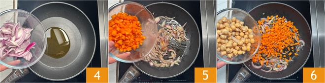 Em uma frigideira antiaderente coloque um fio de azeite, adicione as cebolas 4 e refogue em fogo médio-baixo por cerca de 4 minutos ou até que estejam macias e douradas. Junte as cenouras 5 e o grão-de-bico bem escorrido 6.