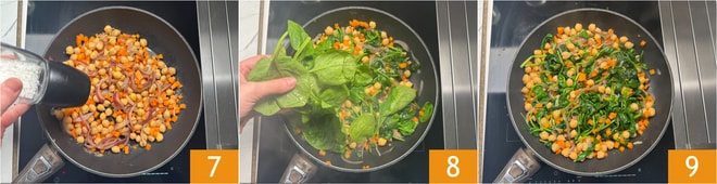 Tempere com sal 7 e cozinhe por cerca de 8 minutos. Depois adicione os espinafres 8, um pouco de cada vez, pois sendo volumosos não cabem todos na frigideira, então espere que murchem um pouco antes de adicionar o restante. Cozinhe por 5 minutos 9 e deixe esfriar um pouco.