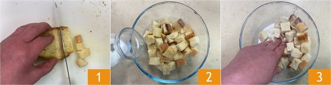 Para preparar o polpettone macio, primeiro prepare o Caldo de carne e mantenha-o quente. Corte o pão amanhecido em cubos 1, transfira para uma tigela e adicione o leite 2. Aperte com as mãos para garantir que fique completamente molhado 3, depois deixe de molho por cerca de dez minutos.