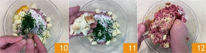 Tempere com noz-moscada 10, sal e pimenta, depois adicione também o pão bem espremido 11. Misture a massa amassando com as mãos 12.