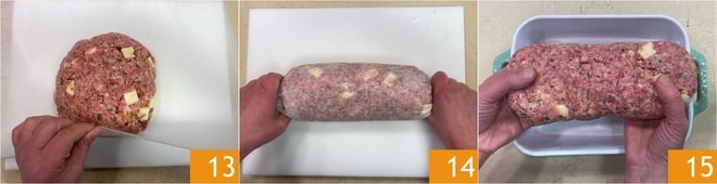 Coloque a massa no centro de uma folha de papel manteiga 13 e use-a para moldar e dar forma ao polpettone 14. Agora, retire o papel e transfira o polpettone para uma assadeira 15.