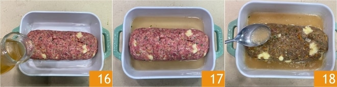Despeje o caldo sobre o polpettone e na assadeira 16, depois asse no forno estático pré-aquecido a 180ºC por cerca de 45 minutos 17. Durante o cozimento, regue o polpettone ocasionalmente com o caldo para garantir que ele permaneça úmido 18.