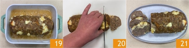 Quando o polpettone estiver dourado na superfície, verifique com um termômetro de carnes que a temperatura no centro seja de pelo menos 70ºC, depois retire do forno e deixe descansar na assadeira por 10-15 minutos 19; desta forma, os sucos se distribuirão uniformemente, mantendo o polpettone macio. Após o tempo de descanso, seu polpettone macio está pronto para ser fatiado 20 e servido 21!