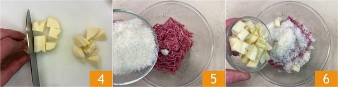 Enquanto isso, corte em cubos também o provolone 4. Coloque a carne moída em uma tigela grande, depois adicione o Parmesão ralado 5 e o provolone em cubos 6.