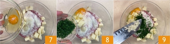 Adicione também o ovo 7, a salsinha picada 8 e o dente de alho picado 9.