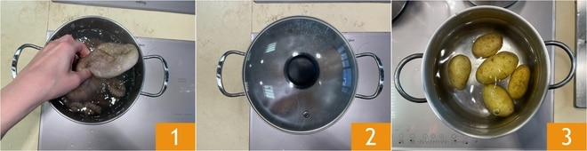 Para preparar o polvo sobre creme de ervilhas e batatas, a primeira coisa é cozinhar o polvo, mergulhando-o em água fervente com sal 1. Tampe com uma tampa 2 e cozinhe por cerca de 30-40 minutos, até que esteja macio. Enquanto isso, cozinhe também as batatas 3, começando com água fria. Cozinhe-as por cerca de 30 minutos, até que, ao espetá-las com os dentes de um garfo, estejam macias.