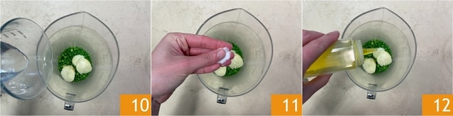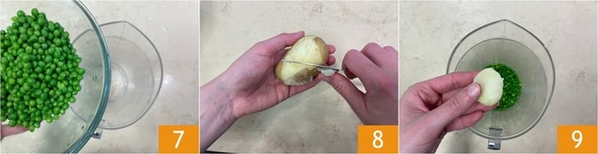 Transfira as outras para um recipiente alto e estreito 7. Assim que as batatas estiverem cozidas, descasque-as 8 e corte em fatias. Em seguida, junte-as às ervilhas 9.