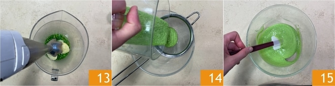 Bata com um mixer de imersão 13 e passe a mistura por uma peneira 14 até obter um creme liso 15.