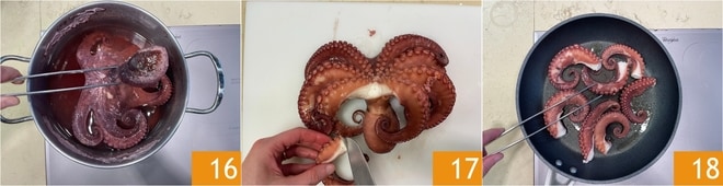 Assim que o polvo estiver cozido, retire-o da água 16 e corte os tentáculos com uma faca, deixando-os inteiros 17. Em uma frigideira antiaderente quente, despeje um fio de óleo e coloque os tentáculos do polvo 18.