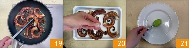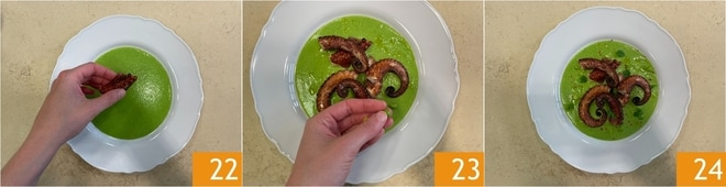 Doure bem os tentáculos de ambos os lados, virando-os com uma pinça na metade do cozimento 19. Transfira-os para uma bandeja, salgue-os 20 e corte-os ao meio. Agora disponha no fundo de um prato o creme de ervilhas 21.