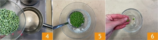 Escalde as ervilhas em água fervente 4 por alguns segundos, depois escorra e mergulhe em água com gelo 5. Descasque algumas 6 e reserve para a decoração final.