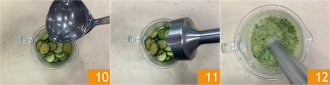 Transfira para um mixer, adicione um pouco de água 10, um fio de azeite e bata 11 até obter um creme liso e homogêneo 12, reserve.