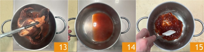 Quando o polvo estiver cozido, retire-o da panela 13 e deixe esfriar completamente. Enquanto isso, mantenha o líquido de cocção no fogo 14 e reduza-o pela metade 15.