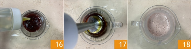 Transfira para um mixer, adicione o azeite 16 e bata 17 até obter um molho não muito espesso 18. Para ajustar as quantidades, considere que a dose de azeite deve ser o dobro da dose do líquido reduzido.