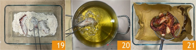 Quando estiver frio, corte o polvo em pedaços, passe-os na farinha de arroz 19 e frite-os em óleo de amendoim, a 180°C, por alguns minutos, até ficarem crocantes 20. Escorra-os em papel absorvente para eliminar o excesso de óleo 21.