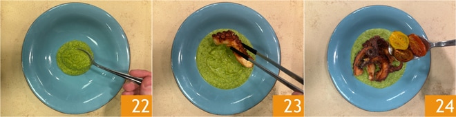 Agora monte o prato: no fundo do prato coloque o creme de abobrinha 22, continue com o polvo frito 23 e os tomatinhos 24.