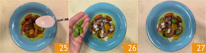 Complete com uma colher de molho 25 e algumas folhas de manjericão 26. O polvo frito gourmet está pronto para ser degustado 27.