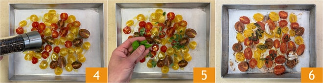 Coloque o polvo, já limpo, na panela e cozinhe a seco, com tampa, por 40 minutos 1. Enquanto isso, corte os tomatinhos ao meio 2 e coloque-os em uma assadeira forrada com papel manteiga 3.