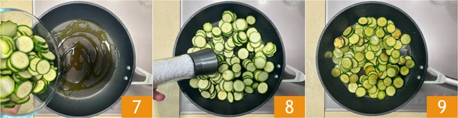 Corte as abobrinhas em rodelas e coloque-as em uma frigideira com um fio de azeite 7, tempere com sal e pimenta 8 e cozinhe até ficarem douradas 9.