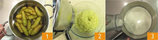 Para realizar o creme de batatas, primeiro cozinhe as batatas: coloque-as em uma panela com água fria, leve para ferver e cozinhe por cerca de 30 minutos, dependendo do tamanho 1. Uma vez cozidas, descasque-as e passe imediatamente por um espremedor de batatas enquanto ainda estão quentes 2. Enquanto isso, misture o leite e o creme de leite em uma panelinha 3 e leve para quase ferver.