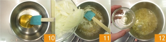 Para fazer o molho barbecue, primeiro limpe e fatie finamente a cebola. Despeje o mel em uma panelinha e aqueça em fogo moderado 10, depois adicione a cebola 11 e deixe murchar por cerca de 5 minutos, cuidando para não mudar de cor. Neste ponto, adicione o vinagre de vinho branco 12 e a mostarda.