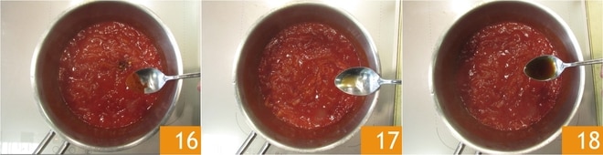 Adicione também o extrato de tomate 13, o molho de tomate 14 e uma pitada de pimenta 15.