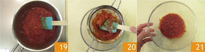Misture e cozinhe o molho por mais alguns minutos 19, depois passe por uma peneira para eliminar a cebola 20 e mantenha em uma tigela 21.