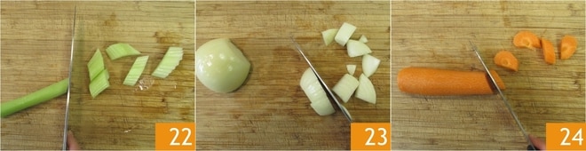 Para preparar o polvo, primeiro limpe e corte em pedaços grosseiros o aipo 22, a cebola 23 e a cenoura 24.