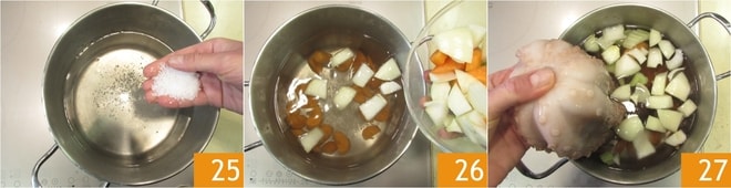 Encha com água uma panela grande, depois adicione um punhado de sal grosso 25, a pimenta branca em grãos e os vegetais 25. Mergulhe o polvo 27 e cozinhe por 55 minutos a partir do momento em que a água começa a ferver.