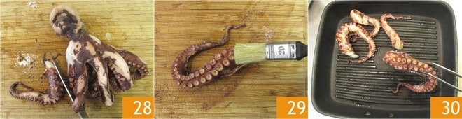 Uma vez cozido, coloque o polvo em uma tábua e separe os tentáculos do resto do corpo 28. Pincele os tentáculos com o óleo 29, depois coloque-os em uma chapa quente para deixá-los crocantes por fora 30.