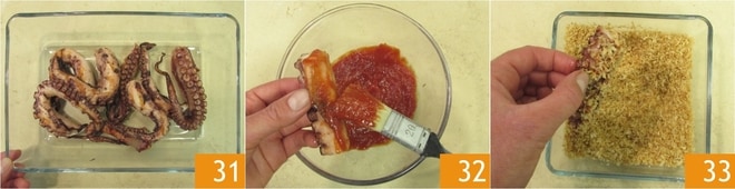 Quando os tentáculos estiverem prontos 31, você pode montar os ingredientes: corte os tentáculos ao meio e pincele os lados e a parte inferior com o molho barbecue 32, depois cubra com o panko 33 que você terá previamente torrado na manteiga e deixado secar em um pano.