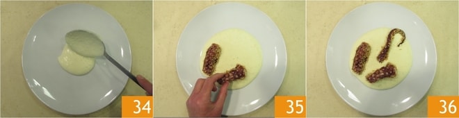 Distribua o creme de batatas no prato, ajudando-se com as costas de uma colher 34, e coloque os tentáculos empanados por cima 35. Seu polvo na chapa sobre creme de batatas está pronto para ser servido 36!