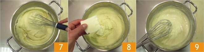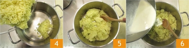 Coloque as batatas amassadas em uma frigideira 4 e deixe secar em fogo moderado, mexendo com uma colher 5. Quando a mistura de leite e creme estiver bem quente, adicione gradualmente à frigideira enquanto mexe para incorporar 6.