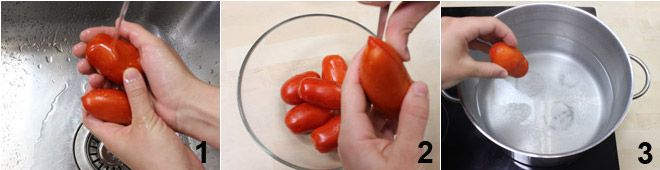 Para preparar os tomates pelados, escolha tomates que sejam firmes, maduros e sem amassados, enquanto isso, coloque no fogo uma panela grande cheia de água. Lave bem os tomates sob água corrente e faça um corte em cruz na extremidade de cada tomate (1-2). Quando a água começar a ferver, escalde os tomates por 2-3 minutos, desse modo os tomates permanecerão firmes 3.