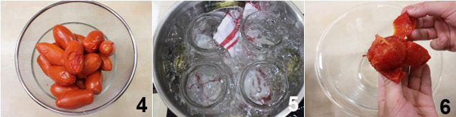 Retire os tomates da água com uma escumadeira e coloque-os para escorrer em um escorredor. Espere que esfriem por alguns minutos, é normal que os tomates comecem a enrugar um pouco 4. Enquanto isso, esterilize os potes e as tampas fervendo-os em água, conforme indicado nas diretrizes do Ministério da Saúde mencionadas ao final da receita 5. Nesse ponto, descasque os tomates que terão ficado mornos 6.