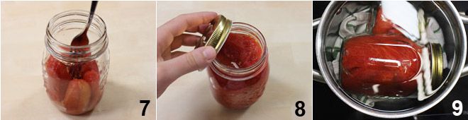 Quando os potes estiverem completamente secos, coloque os tomates pelados nos potes 7, pressionando-os um pouco com um garfo, feche cuidadosamente o pote 8 tendo o cuidado de deixar 2 ou 3 centímetros de espaço da borda, então passe para a fervura ou pasteurização, seguindo as instruções indicadas nas diretrizes do Ministério da Saúde mencionadas ao final da receita 9. Dessa forma, os potes formarão o vácuo. Uma vez que os potes tiverem esfriado, verifique se o vácuo foi formado corretamente: se ao pressionar a tampa você NÃO ouvir "clik clak" significa que o vácuo foi formado corretamente. Seus tomates pelados estão prontos!