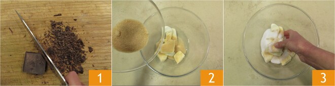 Para preparar a porção individual natalina, comece pelo crumble. Pique o chocolate amargo 1. Em uma tigela, coloque a manteiga, o açúcar mascavo e o açúcar refinado 2. Trabalhe a mistura com as mãos 3.