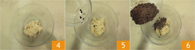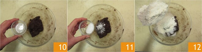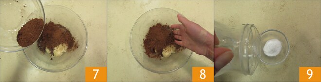 O cacau 7 e misture sempre com as mãos 8. Em uma tigelinha, dissolva o bicarbonato em um pouco de água 9.