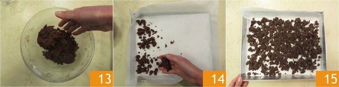 Sove rapidamente 13 e esfarele a massa obtida sobre uma assadeira forrada com papel manteiga 14, distribuindo uniformemente 15. Deixe descansar na geladeira por 2 horas. Asse em forno estático pré-aquecido a 165°C por cerca de 12 minutos.