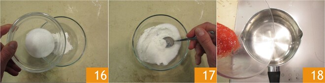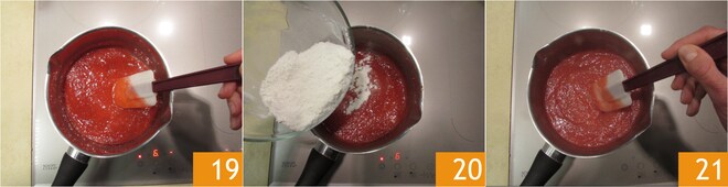 Cuide da geleia: em uma tigela, misture o açúcar com o amido de milho 16 e a farinha de arroz 17. Despeje em uma panela a polpa de lichia 18 e a de framboesas.