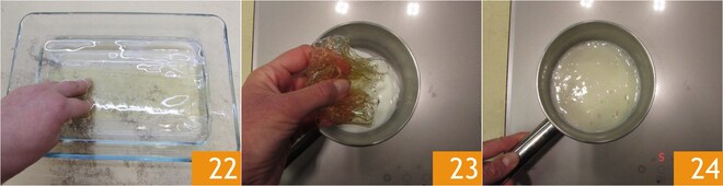 Passe para a mousse: coloque a gelatina em água fria para amolecer 22 por cerca de 10 minutos. Depois, despeje-a em 20 ml de leite quente 23 e misture bem para dissolvê-la 24.