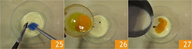 Em uma tigela, despeje o chocolate branco derretido, adicione as sementes de baunilha 25, as gemas 26 e a gelatina dissolvida no leite 27.
