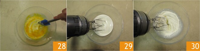 Misture para incorporar 28. À parte, em outra tigela, despeje o creme de leite fresco 29 e bata com uma batedeira elétrica até que fique semi batido 30.