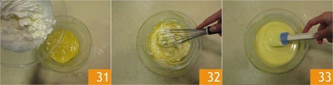 Incorpore o creme de leite à mousse 31, bata novamente com um batedor manual 32 para obter uma mousse areada 33.