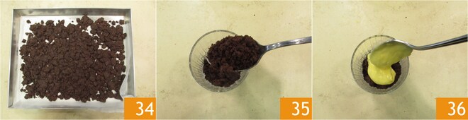 Recupere o crumble assado 34. Pegue 4 copos individuais de 230 ml e despeje no fundo uma colher rasa de crumble 35, cubra com uma colher de mousse 36.